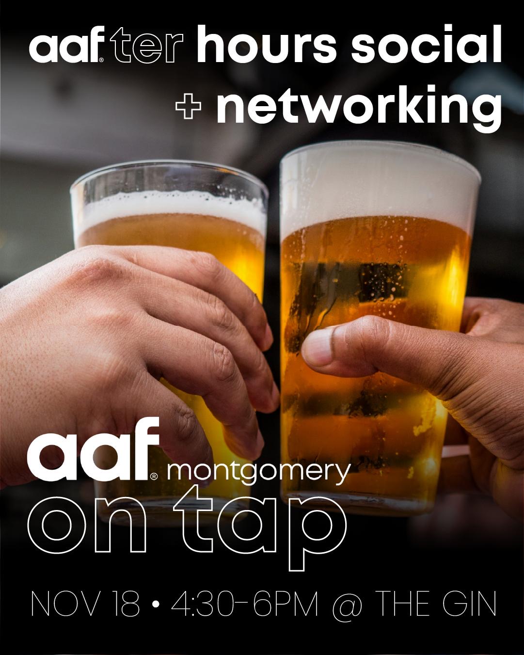 The Gin 9100 Eastchase Parkway Suite E, MontgomeryJoin us for AAF on Tap, an informal evening social designed to connect the local creative community. We’ll meet at The Gin on November 18 from 4:30–6:00 PM. Come for the conversation, stay for the connections—and enjoy a cocktail in a relaxed setting. Bring a colleague or friend; the more, the merrier. Register here: https://aaf-montgomery-6837589ea09e1.springly.org/collect/description/632953-c-aaf-on-tap